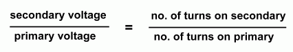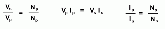 ![]() Example Problem In order to work out problems about how a transformer changes voltage and current, we'll need to develop some equations. Since the voltage is directly proportion to the number of turns, we can write this first equation: ![]() Using symbols, this becomes: ![]() One thing we would like to be able to do is predict the output voltage of a transformer, if we know the primary (input) voltage and the number of turns on both sides. By solving the equation above for Vs, we get: ![]() Let's use this to solve a sample problem: "A step-up transformer has 400 turns on its primary coil and 600 turns on its secondary coil. If the primary coil is supplied with 120 V of alternating current, what will be the secondary (output) voltage?" ![]() Using the equation for Vs , and filling in the other values we see that the output voltage is 180 V. "Continuing the problem, suppose the same transformer produces a secondary (output) current of 8 A. What was the primary (input) current?" ![]() we get the first equation at the left which can be solved for Ip. Filling in the corresponding values gives an answer of 12 A for the primary current. Notice that this is a step-up transformer. The number of turns on the right is 1.5 times as large as the number on the left. As a result, the voltage went up by a factor of 1.5 (from 120 V to 180 V), and the current was reduced by a factor of 1.5 (from 12 A to 8 A). Another problem: "A transformer with 1000 turns on the primary coil and 500 turns on the secondary coil has a primary (input) current of 40 mA. What will be the secondary (output) current?" ![]() Because current is inversely proportional to voltage, we get the first equation, relating secondary and primary currents to the primary and secondary number of turns. Solving for Is and filling in the remaining values gives an answer of 80 mA. This was a step-down transformer, which decreases the voltage. But by cutting the number of turns in half, we doubled the current. ![]() |