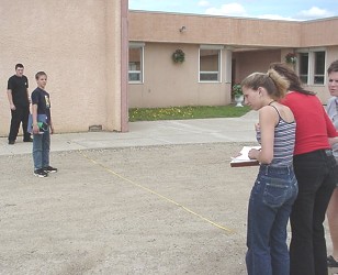 Sr, High Science How close was our answer? Well, the precision of our measurements could have affected the result. Let's have a look at how precise our values were, and find out what sort of effect this might have had on the calculated result. The clinometer's scale is labelled in single degrees. Ideally, we should be able to measure an angle accurately to within half a degree. However, the sights on the clinometer are not very good, and there is no telescope to pinpoint the aiming spot 'exactly'. As a result, our angle measurement could have been off by as much as perhaps two degrees. The measuring tape was more precise, but we didn't make much of an effort to pull it tight. We could have been off on our distance measurement by perhaps as much as 20 cm, or 0.2 m Lets see what effect this error could have on our answer. If our measurements were both too big by 0.2m in distance, and 2 degrees of angle, the values might actually have been 10.2m and 26°. This would make x = 10.2 · tan26 = 4.97m, and the height of the gym 6.17m (We will assume, for simplicity, that the error in measuring the height 1.20m of the instrument was negligible) If our measurements were both too small by 0.2m in distance, and 2 degrees of angle, the values might actually have been 9.8m and 22°. This would make x = 9.8 · tan22 = 3.96m, and the height of the gym 5.16m So we can say that, while we originally calculated the height of the gym to be 5.65 m, its probable height, allowing for errors in measurement, is more likely somewhere between 5.16m and 6.17m. |