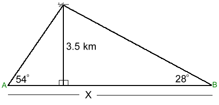 ![]() ![]() Page Two Problem 3: 'A communication tower is supported by expensive cables, some of which are attached at the top of the tower. These cables must be attached to the top at an angle of 32 degrees, and at a distance of 80 metres from the base. Calculate the length of one of these cables'. Here is the diagram: ![]() Here is the diagram with only the essential information, including the side labels: ![]() ![]() Notice that we showed one decimal place, as required. Problem 4: 'A small plane is flying at an altitude of 3.5 kilometres. A person at location A measures the angle of inclination to the plane to be 54 degrees. At the same instant, another person at location B measures the angle of inclination to the plane to be 28 degrees. How far apart are the two people?' Here is the diagram: ![]() Here is the diagram with only the essential information. Do you see the problem? ![]() The distance X we need to find is not the side of a right triangle in the diagram. However, there are two smaller right triangles. If we can find sides y and z, and add these values together, we will get the answer for X. ![]() ![]() Notice that we're carrying two decimal places in this answer because we're not done yet. ![]() ![]() Notice again that we're carrying two decimal places in this answer. ![]() Let's look at more problems on page three ... |