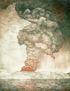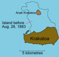 ![]() ![]() As Krakatoa was erupting, ash fell on Singapore (840 km north), and Keeling Island (1155 km southwest), and on ships as far away as 6000 km. Total darkness covered the region near the island itself for three full days. The eruption may have had a plume of dust, rock and smoke 80 km high. It probably ejected over 20 cubic kilometers of material. Eruptions of this size occur only once every few hundred years on Earth. Blast waves from the explosions cracked walls and broke windows up to 160 km away. Ships navigating the seas near Krakatoa reported that floating pumice had formed a layer about 3 meters thick on top of the water. Other ships as far away as 250 km reported that their decks were covered with volcanic dust three days after the end of the eruption. On nearby islands everything was buried under a thick layer of ash. Plant and animal life were wiped out. People who heard the explosions on Rodriguez Island, over 4600 km away, described them as sounding like the distant roar of firing cannons. ![]() This dust in the atmosphere not only created these spectacular atmospheric effects, but also acted as a filter, reducing the amount of sunlight reaching the surface of the Earth. In the year following the eruption, average global temperatures dropped as much as 1.2°C. Weather patterns around the world continued to be affected for years after the eruption. Krakatoa's explosion was 'phreatomagmatic' . Ocean water entered the magma chambers of the volcano; super-heated steam built tremendous pressure, which caused the incredibly large explosion. ![]() ![]() ![]() Whole settlements of indigenous peoples were wiped out. Bodies of victims could be found floating in the ocean for weeks after the event. An additional 1000 or so people also died from volcanic fumes and ashes. ![]() In January of that year a group of scientists visited Anak Krakatau to record its renewed activity and to measure changes in the size and shape of the island. They observed explosive eruptions of pyroclasts from ash to boulders in size. The photograph at the right shows a column of ash rising above the island. Rakata, a remnant of the volcano prior to the 1883 eruption, is in the background The 1883 eruption of Krakatoa was not the largest known in recorded history. The explosion of the volcano of Santorin (Thera) which occurred in the Aegean Sea in in the fifteenth century BC was at least six and one half times greater in energy release than that of Krakatoa. Also, the volcanic explosion of Mount Vesuvius in 79 A.D, the one that buried Pompeii, was greater than that of Krakatoa. 'Krakatoa: The Day the Earth Exploded' by Simon Winchester, Harper Collins Publishing] |