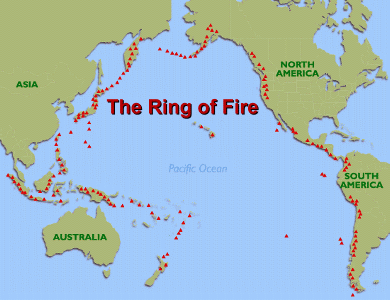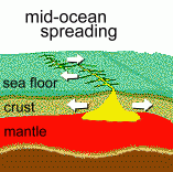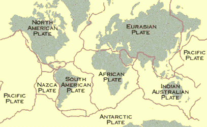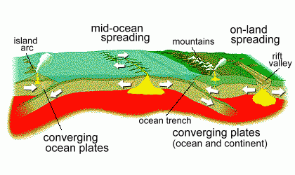 ![]() ![]() The Earth's crust is a thin layer of solid rock forming an outer shell, which is a few dozen kilometres thick. (It's thickness is comparable to the skin on an apple). Under the crust is a deep layer of hot soft rock called the mantle, which gets as hot as 4500 deg C. Below that is the much hotter core of hot liquid iron and nickel, reaching temperatures of 6000 to 7000 deg C. When this molten rock can find a way to the surface through the crust, it erupts into the air as magma, forming a volcano. There are 1500 volcanoes worldwide; 500 of them are active. About 60 major volcanic eruptions occur every year; two or three are usually huge and violent ones. Before you can understand how volcanoes happen, you need to know about plate tectonics. The Earth's crust is actually a collection of solid pieces which are floating on the soft hot mantle below. Picture an ice cream cone that has been dipped into chocolate sauce; the chocolate solidifies on the surface, but is easily broken into many pieces that can slide around on the surface of the ice cream. Similarly the crust pieces on Earth are floating on the mantle, and can move. There are about 12 large pieces, and all of the plates are moving relative to all the others. ![]() ![]() But the plates are solid. As they are forced to spread apart in the ocean's center, their other sides bump into other plates. It's what happens when two plates bump into each other that causes earthquakes and volcanoes. As the ends of the plates meet each other, what usually happens is that one of them is driven down into the mantle, while the other rides up over it. ![]() At the left side of the diagram, you can see the end of a plate meeting a second ocean-bottom plate. It is forced downward; this is called subduction. At the same time, the plate on the left rides up, creating mountains which form islands above the water's surface; magma that escapes also causes volcanoes. At the right, above, the same thing happens when the ocean plate meets a continental plate; mountains are thrust up. Some of them may be volcanic. At places where two plates meet on land, (on the far right, above) magma can escape; its upwelling will also cause these plates to spread apart. Instead of an ocean floor trench, you get a rift valley. Where magma comes up all along the line between plates, the plates will spread apart. Where moving plates collide, one is forced downward and the other rides up. All of this activity can cause magma to escape to the surface; volcanoes are the result. Where two plates don't meet head-on, but are moving by each other in opposite directions, the plates will occasionally get stuck together. Eventually, as the constant pressure from the other end of the plates causes them to unstick, the sudden jolt as they are set free causes an earthquake. A well-known region where plates are passing by each other like this is in southern California, where earthquakes from the sticking and slipping plates are common. Subduction zones, where one plate is being forced downward into the hot mantle, are also the cause of deep ocean trenches and large earthquakes. But subducting plates don't descend smoothly; they do it in big and little jumps. When there is an earthquake under the ocean, it is because the descending side of the ocean floor suddenly drops downward. The resulting vertical fault will generate a tsunami, or harbor wave, in the ocean above, often with disastrous consequences. ![]() Each red triangle on the map represents a volcano; some of the most violent volcanoes ever to erupt happened somewhere along this ring. In 1883, the region just north of Australia saw one of the most catastrophic volcanic eruptions in recent human history, when the island of Krakatoa all but vanished in a colossal explosion. We'll tell you more about that later. Island arcs are also caused by escaping molten rock. An example is the Aleutian Island chain off Alaska, the long chain of volcanic islands at the top of the map. 5% of volcanoes are not near the edges of plates. They are over 'hot spots'in the Earth's crust where hot currents from the core have risen up through the mantle to burn a hole through the crust. The Hawaiian Islands, part of a chain of old volcanoes 6000 km long, were formed as the crustal plate they sit on moved slowly over a hot spot, forming volcanic islands one after the other as the plate moved over the hot spot. Hot spots can also create geysers and hot springs by heating water in the crust. Summary: