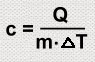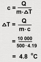 Water has a very high specific heat capacity compared to other substances, as you already know. The information on this page is covered in Science 9. Specific heat capacity: The amount of heat energy (in joules) needed to raise the temperature of one kilogram of a substance by 1 degree Celsius. What this means is that water can take a lot of heat from the environment, and store it. The more heat that is required to raise the temperature a certain amount, the more energy gets stored by the molecules of that substance. In the case of water, that amount of heat is very high... a kilogram of it it sucks up a lot of heat energy while having its temperature raised just one degree. . You can calculate how much heat energy water stores when heated, using the formula for specific heat capacity: Here, c is the specific heat capacity of a substance. You can find c by entering the value of the heat Q needed to raise the temperature of m kilograms of that substance by delta T, which is the temperature rise. (You may be more familiar with the symbol E for the supplied heat energy.)