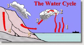 Energy can be obtained from water as it makes its way downwards, back to the oceans (5) under the influence of gravity ... we use hydroelectric dams to extract some of this energy. The whole cycle is powered by the sun, which supplies the energy to evaporate (1) trillions of tons of water every day, from all bodies of water. Because the earth rotates, and is tilted on its axis, and because some areas of the surface warm more than others, different regions of the atmosphere will heat at different rates. Some areas will be warmer than others. This creates convection currents, which cause the air to move around. The moving air takes the water vapour with it. As this air moves around, it may move upwards, or it may encounter an area of low pressure, or it may do both. When it does, it expands and cools. The water vapour will condense, forming liquid water droplets. Lots of these droplets make clouds. If water droplets are lifted to great heights by a storm, where it is very cold, or if the falling droplets encounter a cold layer of air, the water may solidify to become snow. Snowflakes occur when water turns to a solid under conditions which allow the molecules to build on one another in a crystalline pattern. Why are they always 6-sided? Find out here. The hydrologic cycle is supposed to be a closed loop. That means that the amount of water circulating through the biosphere is a fixed amount ... it doesn't change. Humans have inserted themselves into this loop, drawing off some of the water for our own purposes, and then returning it to the cycle. We see it as a renewable resource, one that keeps replenishing itself after we use it. Only by ensuring that the people you elect to government care at least as much about the environment as they do about the companies who pollute it in the name of profit, will the problem get solved. |