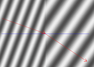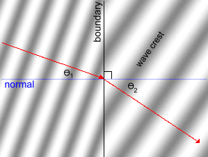 ![]() ![]() In terms of waves in a large body of water like an ocean, the 'different material' is a region with different depth. Waves will change direction as they pass into an area at an angle, where the water is deeper or shallower. Let's look at how this works. First some definitions. ![]() The normal line is a line perpendicular to the boundary. The angle of incidence θ1 is the angle the incoming waves make with the normal. The angle of refraction θ2 is the angle the waves make with the normal after crossing the boundary. You can see here that θ2 is larger, indicating that the wave direction moved farther away from the normal line. When a surface water wave passes from one depth to another, it will refract. The frequency of the waves does not change, as this was predetermined by the original source of the waves. This means that the wave speed v and the wavelength λ are directly proportional to each other; as one increases, so does the other, according to the equation: v = f · λ where v is the wave speed, f is the frequency, and λ is the wavelength. The speed of the waves is a property of the medium in which they travel; in this case, the speed depends on the depth of the water. The wavelength may shorten or lengthen depending on the speed. Sound waves in air behave in a similar fashion, where the speed of sound primarily depends on the temperature of the air through which the sound waves travel. With light, the speed varies because of the varying optical densities of materials. The higher the optical density of a material, the slower a light ray moves through it. The lower the optical density, the faster the light propagates through it, with the fastest speed ocurring in a vacuum, where the wave speed is about 300,000 kilometres per second. Seismic wave refraction follows the same principle. If seismic waves from an earthquake travel more slowly in a material, they will be refracted upward. However, if the seismic waves travel faster in the next material, they will be refracted downward, until they reach a critical angle that will allow them to travel back to the surface. The different speeds and resultant path length differences allow an earthquake's epicentre to be located. The deeper the water, the faster a surface wave will travel, and the lower the height (amplitude) of the waves will be. As waves on the ocean come near shore where the depth is shallower, they slow down and get taller, preserving the amount of energy in the wave. For example, ocean tsunamis travel at about 960 kph in deep water, and may only be a few centimetres to a half metre high, making them very difficult to detect. When they reach the shoreline they are traveling much more slowly, but are much taller. Now let's look at some diagrams and animations of water waves passing from deep to shallow water. ![]() ![]() ![]() The waves are incident from the left, passing through deep water. They make an angle θ1 with the blue normal line. Their speed in deep water is higher, meaning the wavelength is also bigger. After crossing the boundary into shallow water, the wave direction changes, moving toward the normal with a smaller refraction angle θ2. Because they're now moving slower, the wavelength is also smaller. When waves move from shallow water to deep, everything is reversed. The slow moving, short wavelength shallow waves change direction at the boundary with deep water, moving away from the normal and now moving faster with a longer wavelength. ![]() ![]() NOTE: We use the word 'speed' here, when it more properly should be called 'velocity', as the movement of waves has a direction. We're ignoring the difference here, since a wave's direction is not pertinent to the properties of waves. |