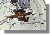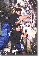 I'm sure you've seen astronauts in the Shuttle, on T.V., and marvelled at how they seem to float around,... almost as if there were no gravity! Have you ever wondered about the things they never show on TV... like, what happens if somebody throws up? How do they go to the bathroom?? Believe it or not, these are actually important questions; they pose problems that scientists have been working on for a long time. Before we show you their answers, we need to clear up a very common misunderstanding. When an astronaut in orbit is seen to be floating around his spacecraft, he is indeed 'weightless', if you mean by this, 'He would weigh nothing if he were standing on a bathroom scale'. But it is wrong to say that the force of gravity on him is zero, or that 'there is no gravity'. Gravity is still there, and it's just about as strong as it is on the surface of the Earth. He is 'weightless' the same way you would 'weigh nothing' if you jumped out of an airplane and were falling freely toward the ground. If a bathroom scale was falling freely beside you, and you tried to stand on it, it would register your weight as zero, because it's falling too. But both you and the scale are still under the pull of the earth's gravity. The force of gravity isn't zero, just the weight In the space shuttle, both the shuttle and the astronauts were falling freely around the earth. That's what an 'orbit' is. Imagine you were inside a big box that someone pitched out of an airplane. You would be floating around inside the box as you and it fell together. Rather than saying the astronauts are 'weightless', it makes more sense to say they are 'continuously falling'... from a height so great that the earth 'curves out of the way' underneath them, so they never hit the ground! The force of gravity at their height above the earth is only slightly less than it is right here on the surface! Actors (including Tom Hanks) in the movie 'Apollo Thirteen' underwent this procedure in order to film the 'weightless' scenes in the movie. The actors ended up having more time 'weightless' than many former astronauts in space ever did! Astronauts often get sick the first time they experience 'weightlessness'. Some always get sick. This can be very unpleasant in the close confines of a spacecraft, since everything floats around, including the vomit! It tends to congeal into large spherical globules that float around the cabin with the air currents. Aside from the unpleasantness of breathing in the stuff, or having it float onto your sandwich, astronauts also have to prevent it from gumming up or shorting out the equipment. The mess is very quickly cleaned up with a vacuum cleaner... which is perfect for sucking errant bits of stuff out of the air! A liquid that the astronauts want to drink, water for instance, can be slid out of its container, where it will hang in the air in a big 'blob'. It can be sucked up with a straw inserted into the 'blob' of water! But to prevent water droplets from shorting out the equipmant, astronauts drink from plastic bulbs with an attached straw. Just like the kind your baby sister uses! ![]() The Shuttle's facilities were a little more up-to-date... but not much. Essentially the urine collection was done the same way, except that you could go to the tube (you didn't wear it). Solid waste was collected by something that acted much like a real toilet, except the waste and flushed water were vacuumed away. It did plug up occasionally. Facilities on the International Space Station are similar. Probably the first real toilet will have to await the construction of a large, rotating space facility, where rotation causes a centripetal force that simulates gravity. Imagine a tiny 'you' standing on the bottom of a bucket that someone is swinging around their head. You would feel 'heavy' in the direction of the bottom of the bucket. Amusement park ride builders know this. Such rotating 'space stations' might supply a sort of 'gravity' for your toilet... but then you'd have the problem of Coriolis forces... |