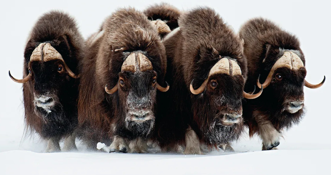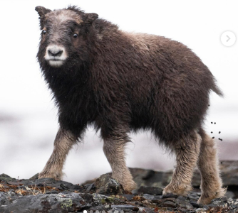 The herds move more often when cows are lactating, to let them get enough food to nurse their offspring. Cows have an eight- to nine-month gestation period, with calving occurring from April to June. Cows do not calve every year, often missing a year when winters are severe. Calves can keep up with the herd within just a few hours after birth. The calves are welcomed into the herd and nursed for the first two months. After that, a calf begins eating vegetation and nurses only occasionally. Cows communicate with their calves through braying. The calf's bond with its mother weakens after two years. Muskoxen are sometimes kept domestically for their wool, and occasionally for meat and milk. The U.S. state of Alaska, for example, has several muskoxen farms specifically aimed at wool harvesting. The wool, called qiviut, is highly prized for its softness, length, and insulation value. A muskox can reach speeds of up to 60 km/h. Their life expectancy is between 12 and 20 years. The primary predators of muskoxen are arctic wolves. Other occasional predators, likely only of calves or sick adults, can include grizzly bears and polar bears, as well as wolverines. If there are many predators, such as a pack of wolves, muskoxen form a defensive circle. Adults stand shoulder to shoulder facing the threat, with the young inside the circle. Both sexes have horns, which they point towards the threat. ![]() Muskoxen are not known to be aggressive. Fatal attacks are extremely rare, but humans who have come close and behaved aggressively have occasionally been attacked. Some information obtained from Wikipedia |